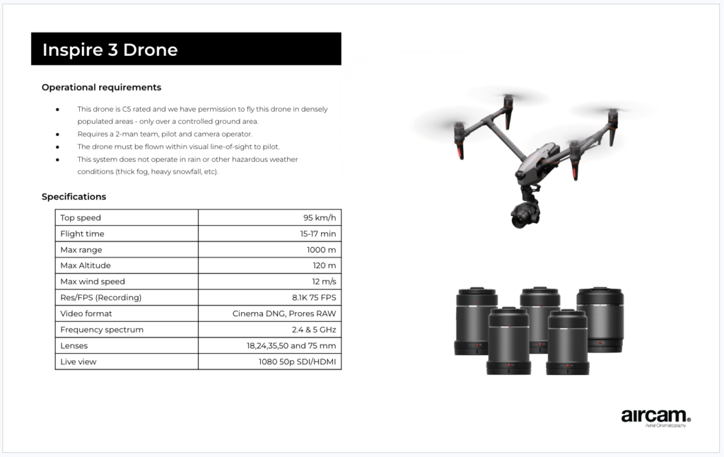 This equipment is very compact and reliable. The drone comes with a built-in full-frame camera and shoots up to 8.1K in RAW format. It is possible to switch to different lenses. In short, our daily used drone.